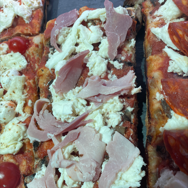 Sauce tomate, maison, champignons, jambon, blanc, mozzarella.